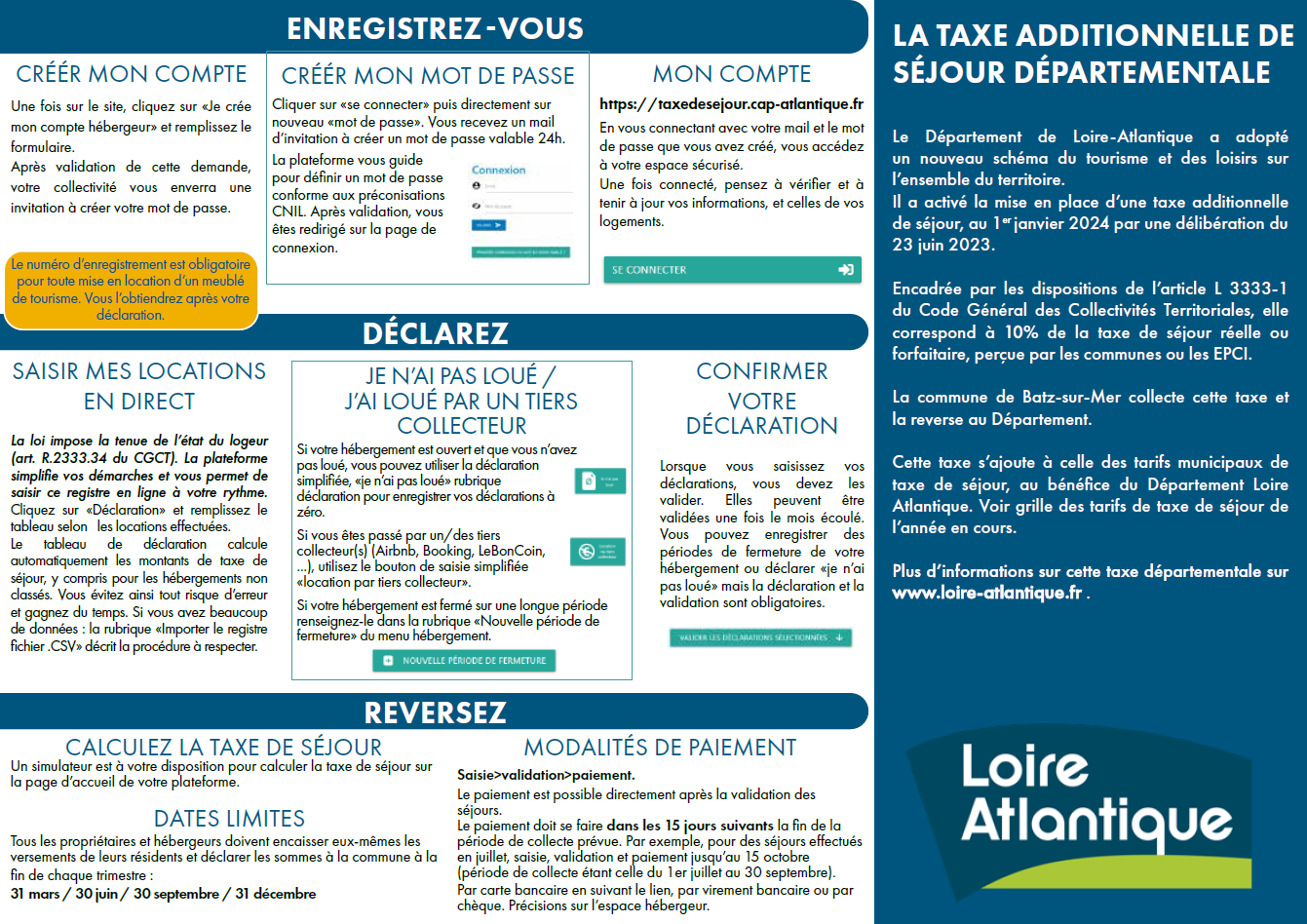 The department of Loire-Atlantique has adopted a new tourism and leisure scheme throughout the territory. He activated the implementation of an additional tourist tax on January 1, 2024, by a deliberation on June 23, 2023. Governed by the provisions of Article L 3333-1 of the General Code for Local Authorities, it corresponds to 10% of the actual or flat-rate tourist tax collected by municipalities or EPCIs. The municipality of Batz-sur-Mer collects this tax and returns it to the Department.